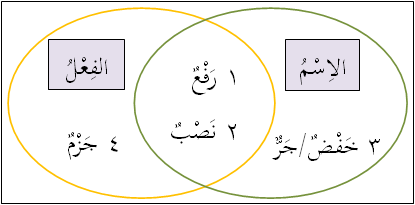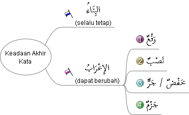 Bina' dan I'rabKamis, 23 Oktober 2014 | Bahasa Arab[Update: 24/10/2014] A. Pengertian Bina' dan I'rab Bina' adalah tetapnya keadaan akhir kata pada satu kondisi tertentu. Kelompok kata yang selalu tetap keadaan akhirnya kita sebut dengan mabni. Contoh: ِهُوَ , نحْن , هَذِه Kata "huwa" pada contoh di atas selalu dibaca dengan "huwa", tidak bisa dibaca dengan "huwu" atau "huwi". Sedangkan i'rab, adalah perubahan keadaan akhir kata karena adanya suatu faktor tertentu. Pada isim, perubahan keadaan akhir katanya ditentukan oleh kedudukan kata tersebut dalam kalimat, apakah sebagai subjek, objek dst. Sedangkan pada fiil, perubahannya disebabkan adanya penambahan huruf/kata lain sebelumnya. Kelompok kata yang dapat berubah keadaan akhirnya kita sebut dengan mu'rab. Contoh: هذا أسدٌ (ini adalah singa) رأيتُ أسدًا (aku melihat singa) أحمد كالأسدِ (Ahmad laksana seekor singa) Perhatikan kata "asadun" (singa) di atas, harakat akhirnya bisa dhammah, fathah dan kasrah. Harakat akhir yang bisa berubah-ubah inilah yang kita istilahkan dengan i'rab. ![]() B. Jenis I'rab Ada empat jenis i'rab, yaitu: [1] Rafa' Contoh: قلمٌ , كتابٌ Tanda asli dari i'rab rafa' adalah harakat akhir dhammah. Bisa dilihat pada contoh di atas, semuanya memiliki harakat akhir dhammah / dhammatain. Di sini digunakan istilah tanda "asli" karena tidak selamanya demikian. Ada juga kata yang memiliki i'rab rafa' tapi tidak berharakat akhir dhammah. Kelompok kata yang berada dalam kondisi rafa' disebut dengan marfu'. [2] Nashab Contoh: قلمًا , كتابًا Kata yang beri'rab nashab biasanya berharakat akhir fathah (tanda asli). Kelompok kata yang berada dalam kondisi nashab disebut dengan manshub. [3] Khafdh atau Jar Contoh: قلمٍ , كتابٍ Kata yang beri'rab khafdh biasanya ditandai dengan harakat akhir kasrah (tanda asli). Kelompok kata yang berada dalam kondisi khafdh / jar disebut dengan majrur. [4] Jazm Contoh: لاتجْلِسْ , لمْ يَكتبْ Kata yang beri'rab jazm biasanya berakhiran sukun / mati (tanda asli). Kelompok kata yang berada dalam kondisi jazm disebut dengan majzum. Catatan: Pada isim hanya berlaku i'rab rafa', nashab dan khafdh. Tidak ada i'rab jazm pada isim. Sedangkan pada fiil, i'rab yang berlaku adalah rafa', nashab dan jazm. Tidak ada i'rab khafdh pada fiil. Oleh karena itu, harakat akhir "kasrah" (yang merupakan tanda jar/khafdh) menjadi ciri khusus yang ada pada isim dan tidak ada pada fiil. Jika dibuat dalam bentuk himpunan, maka gambarannya adalah sebagai berikut. ![]() C. Pembagian Kata : Mabni dan Mu'rab Bina' dan i'rab dapat terjadi pada isim dan fiil. Berdasarkan hal ini dan beberapa keterangan yang sudah dijelaskan sebelumnya, maka kata (khusus isim dan fiil) dapat diklasifikasikan menjadi mabni dan mu'rab. Pembagiannya dapat dilihat pada gambar berikut. ![]() Insyaallah sebagian penjelasan detilnya akan dilanjutkan pada tulisan-tulisan berikutnya. Semoga Allah memberi kemudahan.. Klik untuk melihat daftar isi : Catatan Pelajaran Bahasa Arab. Komentar nabila 01 Oktober 2015 - 08:35:42 tolong diberi penjelasan tentang macam-macam bina' suyono 15 September 2016 - 03:11:54 Sukron ilmu ini menjadi amal sholeh Rumus Excel 17 Desember 2018 - 13:48:20 Mengingatkanku semasa belajar di Madrasah Diniyah... Nahwu Shorof 07 Maret 2019 - 14:09:06 Sangat bermanfaat dalam menambah kajian ilmu sasta bahasa arab vvv 09 Agustus 2019 - 21:26:13 bagus Compute Expert 10 Maret 2020 - 19:59:15 Terima kasih atas sharingnya |